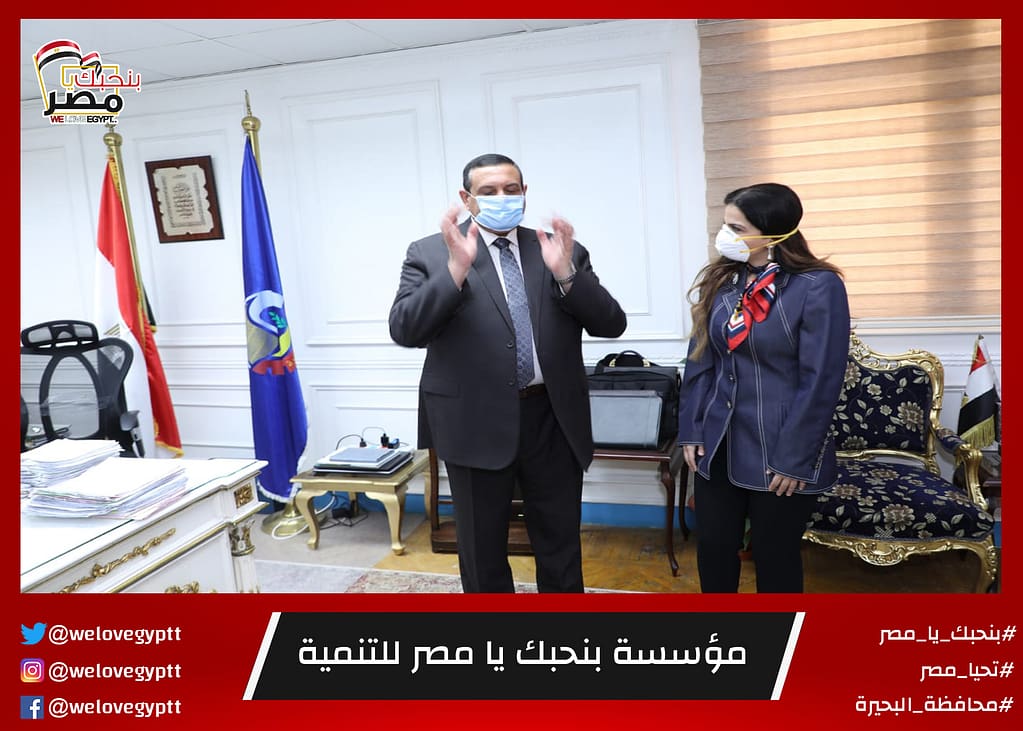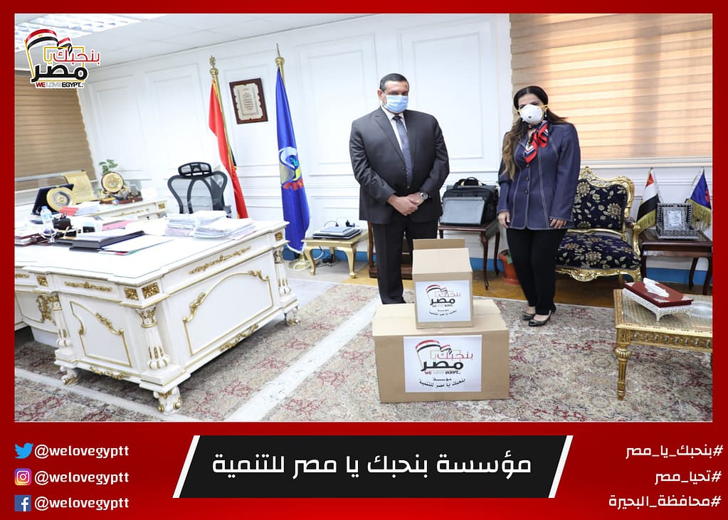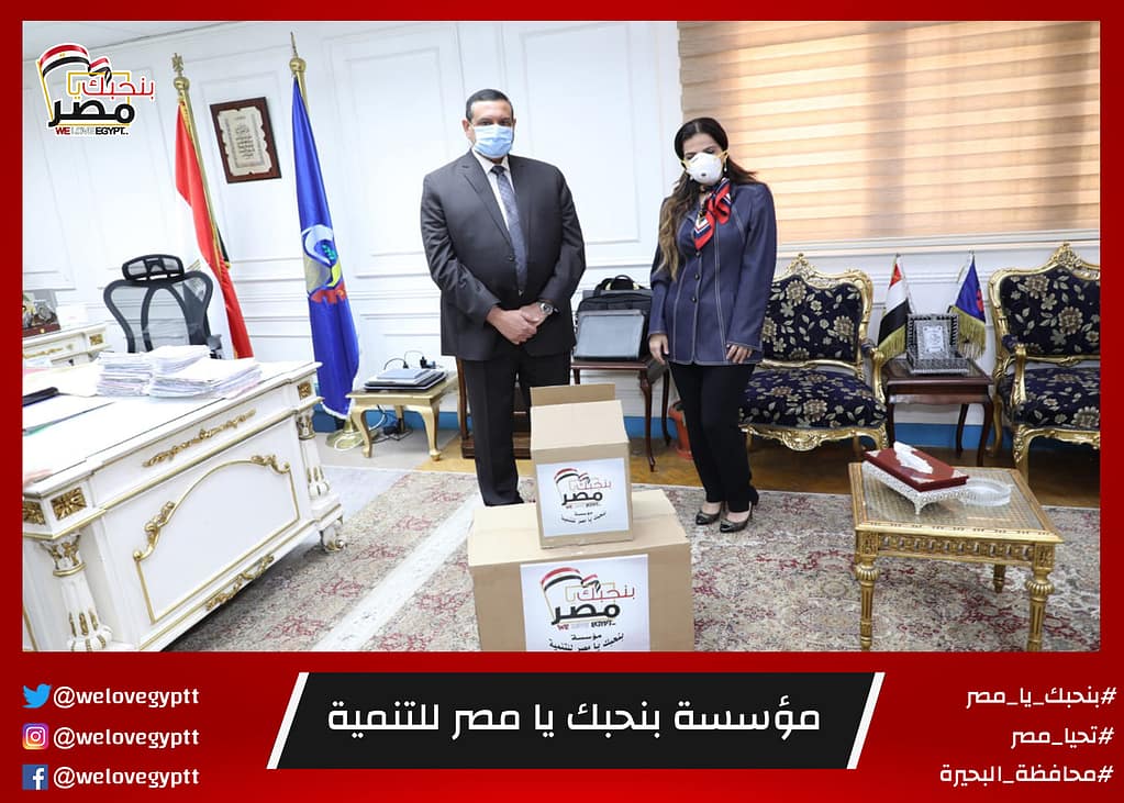 بنحبك يا مصر للتنمية التى تتبرعت بعدد بخمسة آلاف كمامة وعدد من البدل الواقية للأطباء وذلك لتوزيعها على مستشفيات محافظة البحيرة واقد أشاد المحافظ بااهمية المجتمع المدني وخاصة جمعية بنحبك يامصر بتبرعها الكبير لصالح المحافظة وذلك للمساعدة في الحد من زيادة فيروس كورونا والتوعية الدائمة واللجوء إلى للتوجيهات الطبية والصحية بارتداء الكمامات والبدل الواقية للحفاظ على حياة المواطنين وأكد آمنة أنها لن تكون المبادرة الاولى ولا الأخيرة حيث تم الاتفاق مع رئيس الجمعية المهندسة زينب بشير على المزيد من هذه المشاركات فى محافظة البحيرة